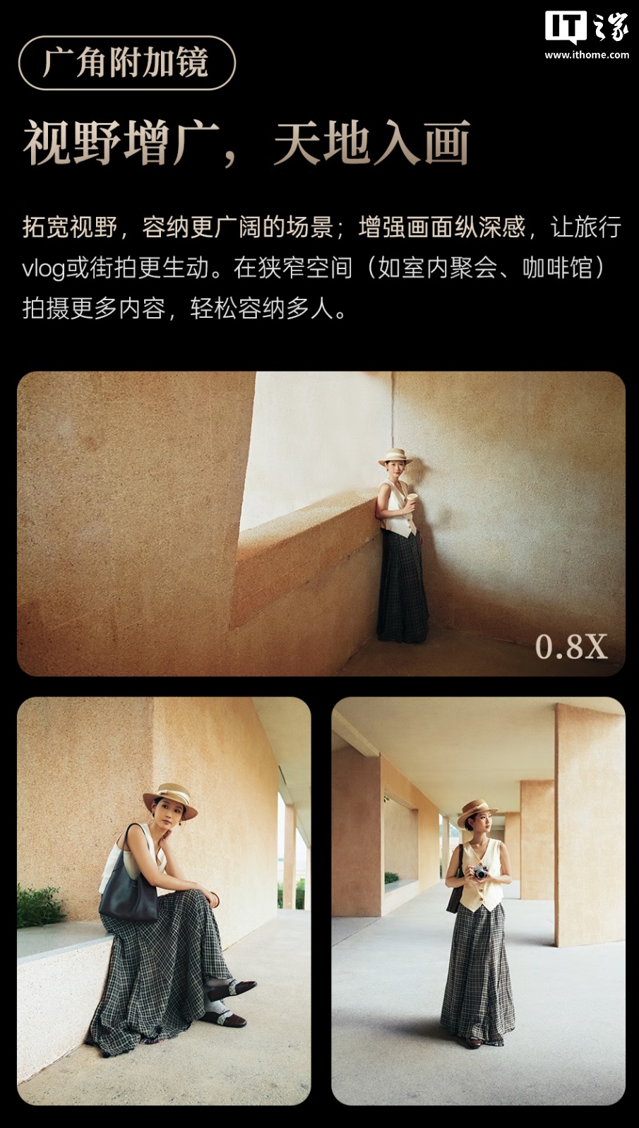 该产品可将原镜头的焦距缩小至 0.8 倍,经过半画幅 1.5 倍换算后,可将原本的 35mm 焦距增广至 28mm 左右,拓宽视野,在狭窄空间内容纳更多事物,还能够让旅行 Vlog 或街拍更加生动。