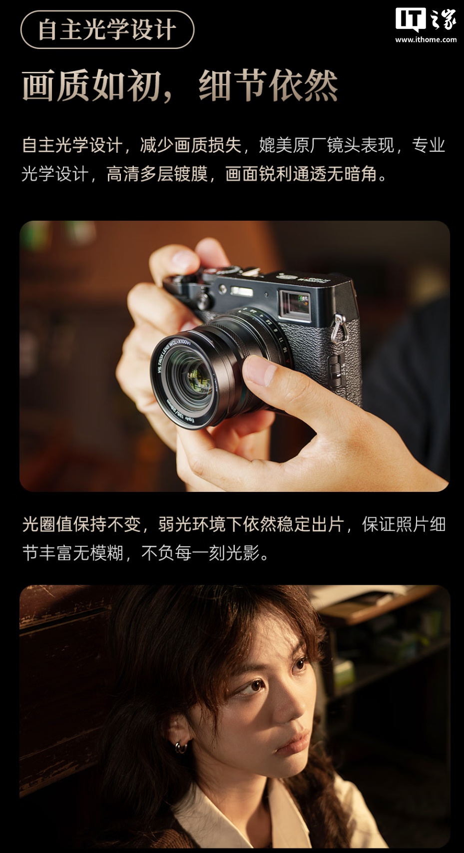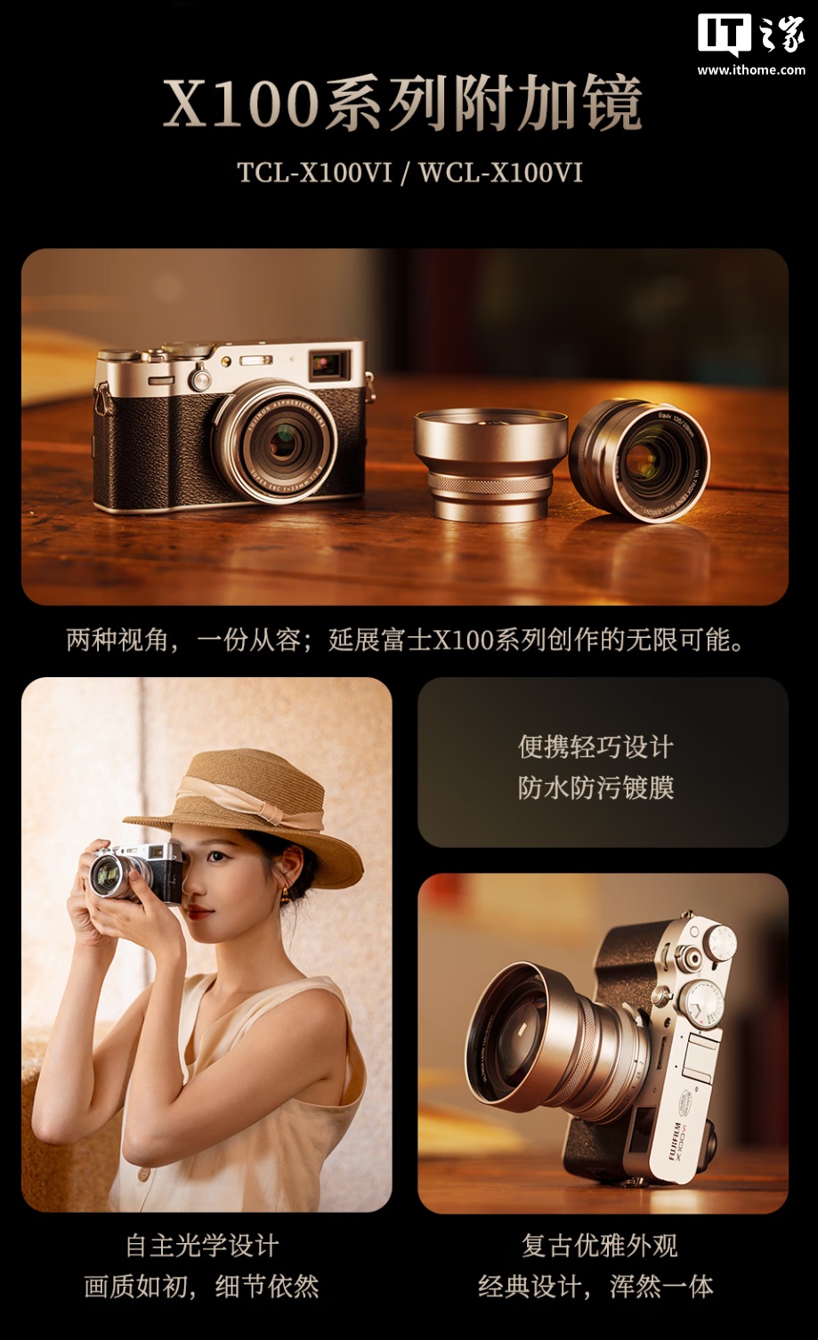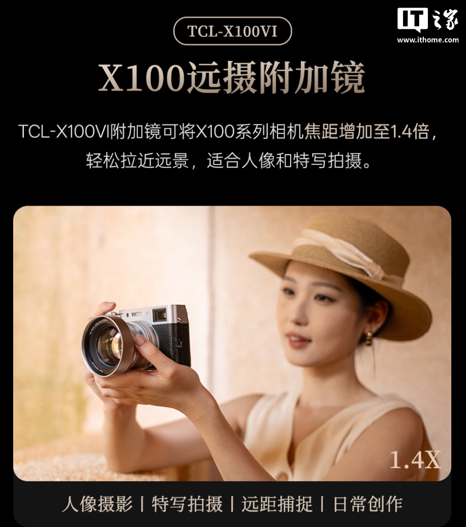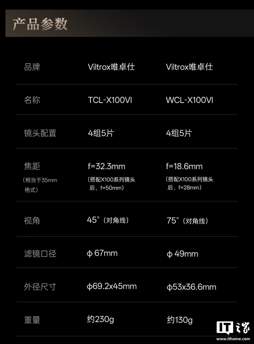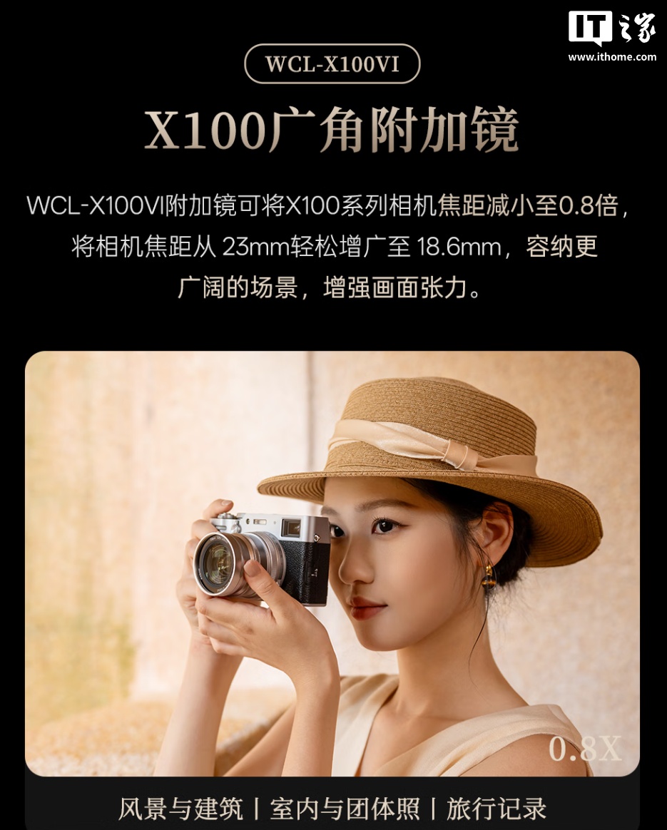 IT之家 12 月 13 日消息,唯卓仕现已推出 WCL-X100VI 广角附加镜,售价 709 元,适配富士 X100 系列半画幅固定镜头相机,可将原镜头的 23mm 焦距增广至 18.6mm,容纳更广阔的场景。