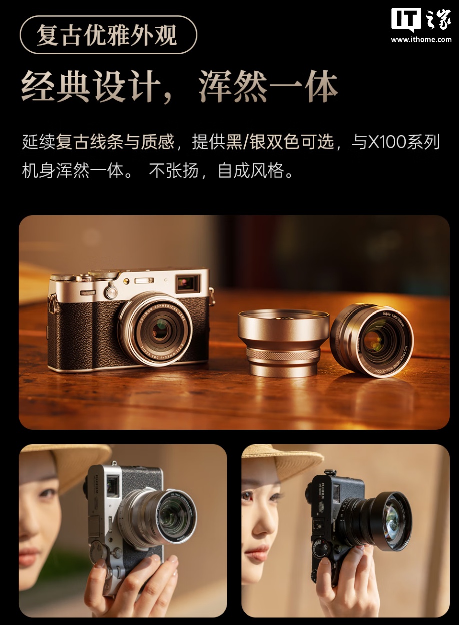 据介绍,这款附加镜兼容富士 X100、X100S、X100F、X100V 和 X100VI 相机,拥有黑色、银色两种配色,采用前置附加的形式,通过螺纹接口安装在到相机镜头前,采用自主光学设计,内置多层镀膜,可减少画质损失,号称“媲美原厂镜头”。