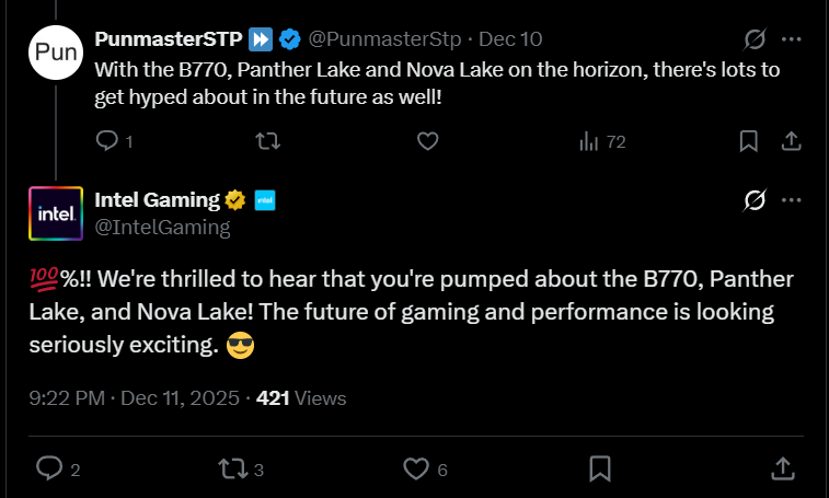 IT之家发稿前查询 X 平台,该条推文已经被删除,不过根据媒体截图,英特尔官方账号表示:“100% 会出现!感受到你对 B770、Panther Lake 和 Nova Lake 的热切期盼,我们深感高兴!我们未来在游戏和性能方面的表现,将值得期待。”