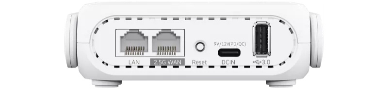 这款路由器配备博通 2.0 GHz 四核 CPU、1GB DDR4 内存、256MB 闪存,提供了一个 2.5Gbps WAN 口、一个千兆 LAN 口,以及 USB-A(移动网络共享)接口和 USB-C(18W PD 供电)。