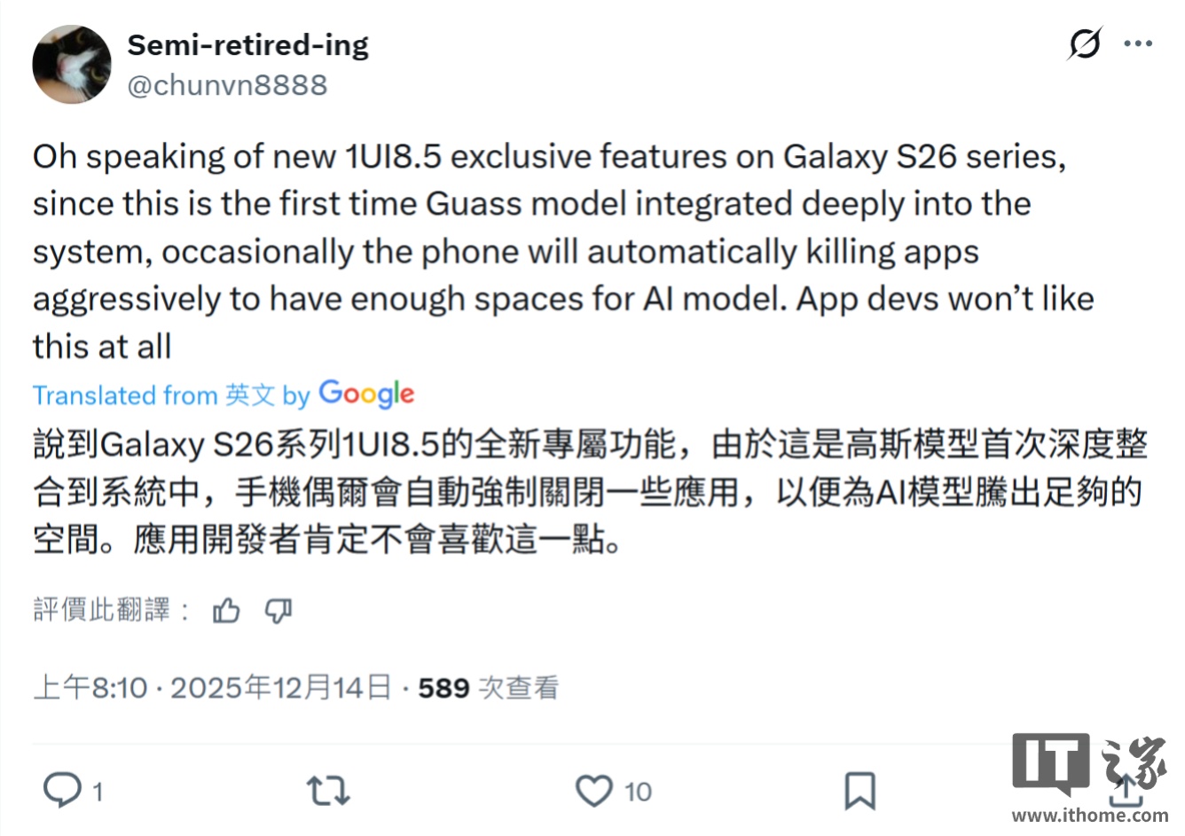 IT之家 12 月 14 日消息,消息人士 Semi-retired-ing 今天在 X 平台发文称,三星 Galaxy S26 系列手机将支持“高斯”本地 AI 模型。