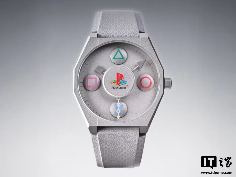 设计方面,这款手表的正面中心拥有 PlayStation 立体徽标,指针造型致敬了 PS1 手柄上的 Start 和 Select 按键,表壳造型也呼应了 PS1 的多切面几何风格,表面采用哑光灰漆,默认的表带则是橡胶材质,背部采用定制镂空设计,灵感来源于光驱转动时的结构美学。