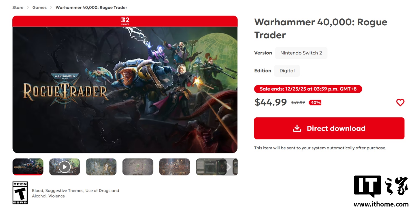IT之家 12 月 14 日消息,《战锤 40K:行商浪人》游戏现已登陆任天堂 Switch 2 平台,目前在美区 eShop 售价 44.99 美元(IT之家注:现汇率约合 318 元人民币),日区 eShop 则是 6500 日元(现汇率约合 294.7 元人民币),支持 6 人多人游玩模式,可在战役中分享邀请码和加载存档来邀请好友加入游戏。