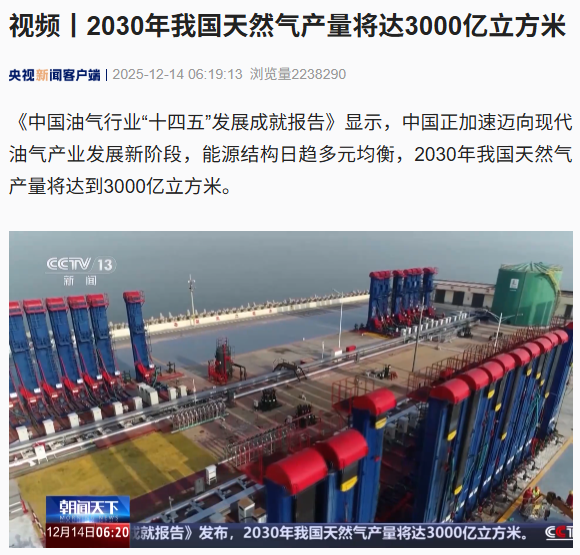 IT之家 12 月 14 日消息,据央视新闻报道,《中国油气行业“十四五”发展成就报告》显示,中国正加速迈向现代油气产业发展新阶段,能源结构日趋多元均衡,2030 年我国天然气产量将达到 3000 亿立方米。