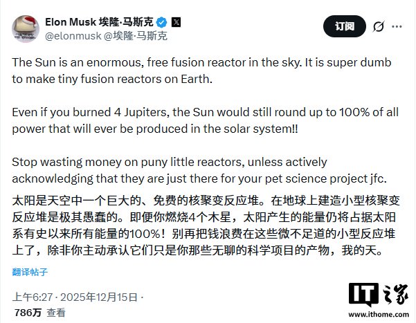 IT之家 12 月 15 日消息,特斯拉首席执行官埃隆・马斯克在社交媒体平台 X 上发文,对在地球上研发微型核聚变反应堆的商业逻辑提出尖锐批评。他指出,太阳本身就是一个悬挂在天空中的巨大且免费的聚变反应堆,试图在地球上复制这种机制制造“微型版”是极其愚蠢的行为。