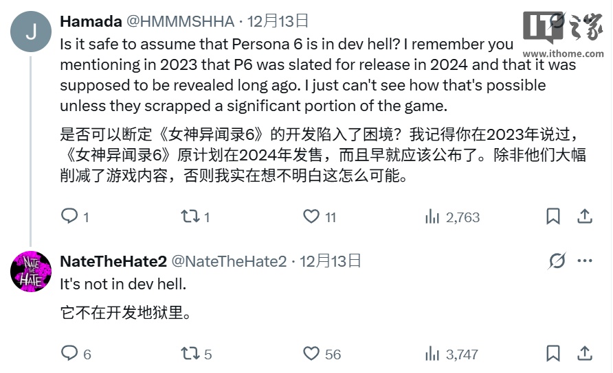 结合消息人士 NateTheHate 上周(12 月 12 日)的回应,《女神异闻录 6》并未陷入所谓的“开发困境”,他曾在 2023 年 5 月时表示,Atlus 内部将游戏定在 2024 年发售,如果按字面理解,这意味着游戏本质上遭遇了跳票。