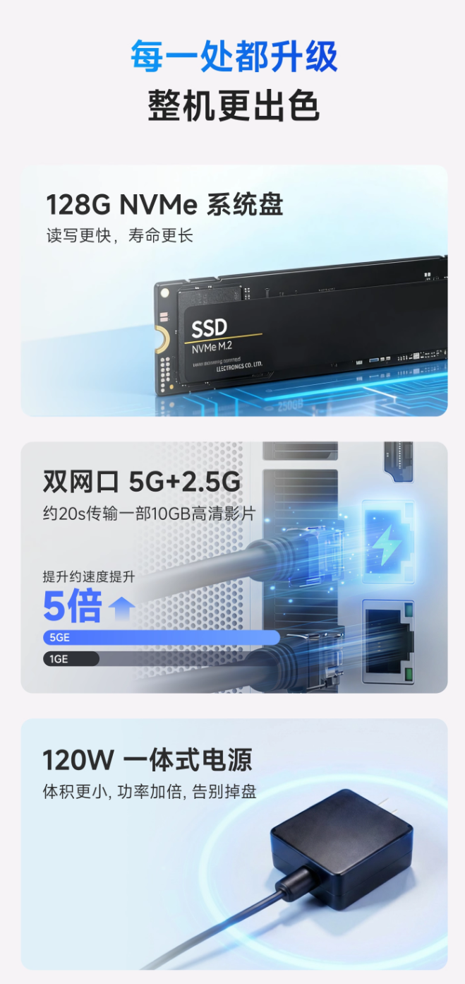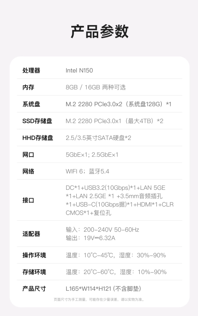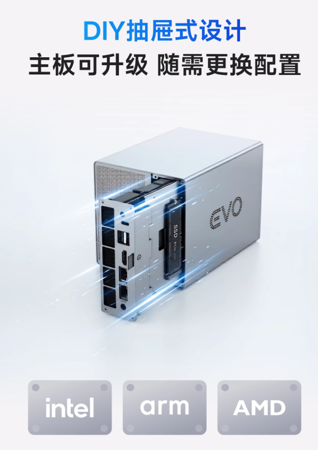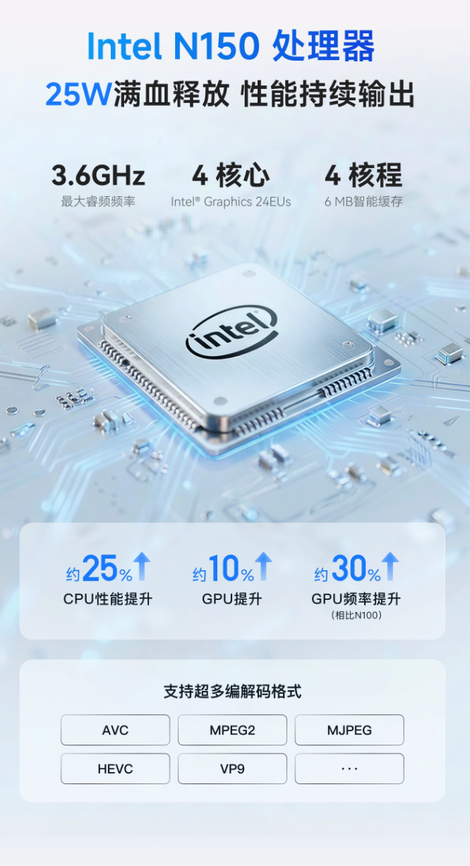 据介绍,这款 NAS 搭载英特尔 N150 四核 CPU,最高睿频可达 3.6GHz,性能释放可达 25W,支持解码 AVC、HEVC、VP9 等视频编码,可选 8GB 和 16GB 内存,主板采用抽屉式推拉设计,可随时升级 / 更换英特尔 / AMD / ARM 平台。