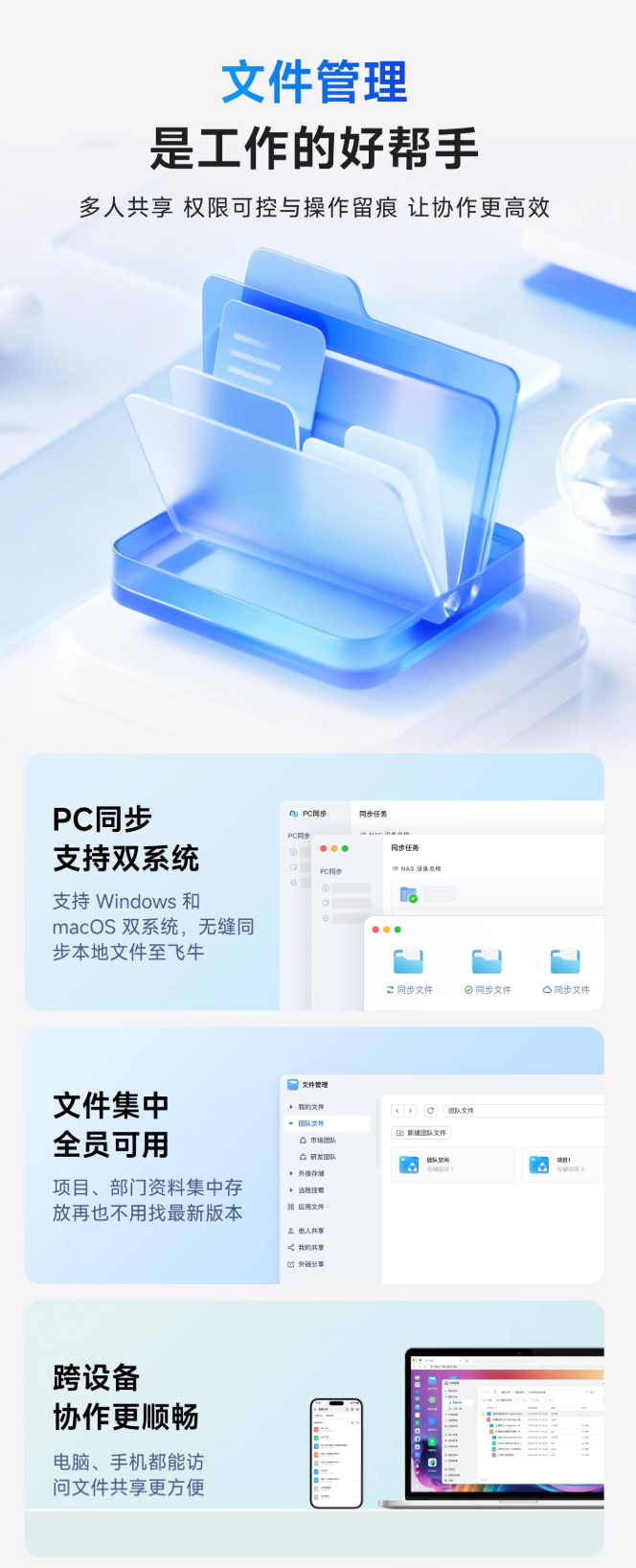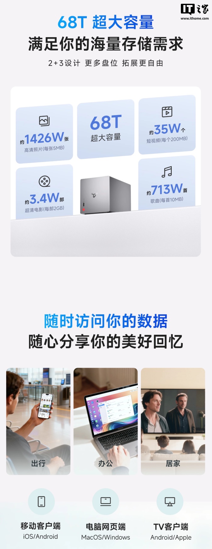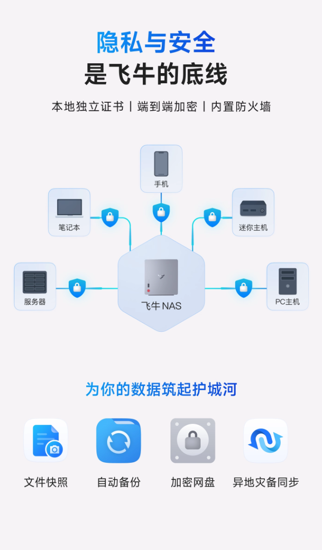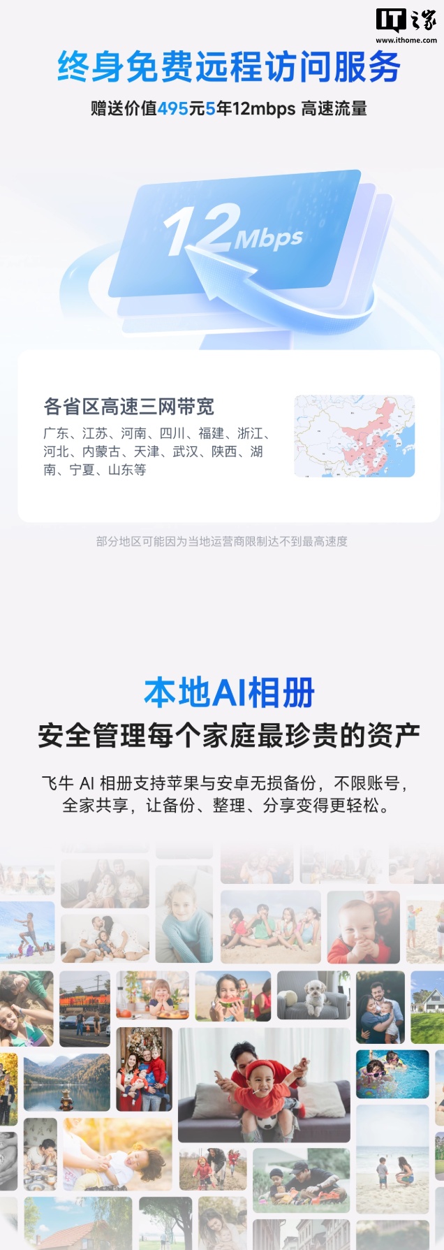 此外,这款 NAS 搭载 fnOS,支持 NFS、SMB、WebDav 等挂载协议,拥有应用商店,可随意安装百款 App,内置虚拟机功能,支持一机多用,自带终身免费远程访问服务,随机附赠 5 年 12mbps 高速流量,价值 495 元。