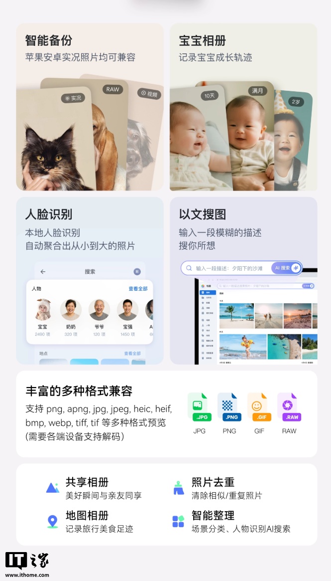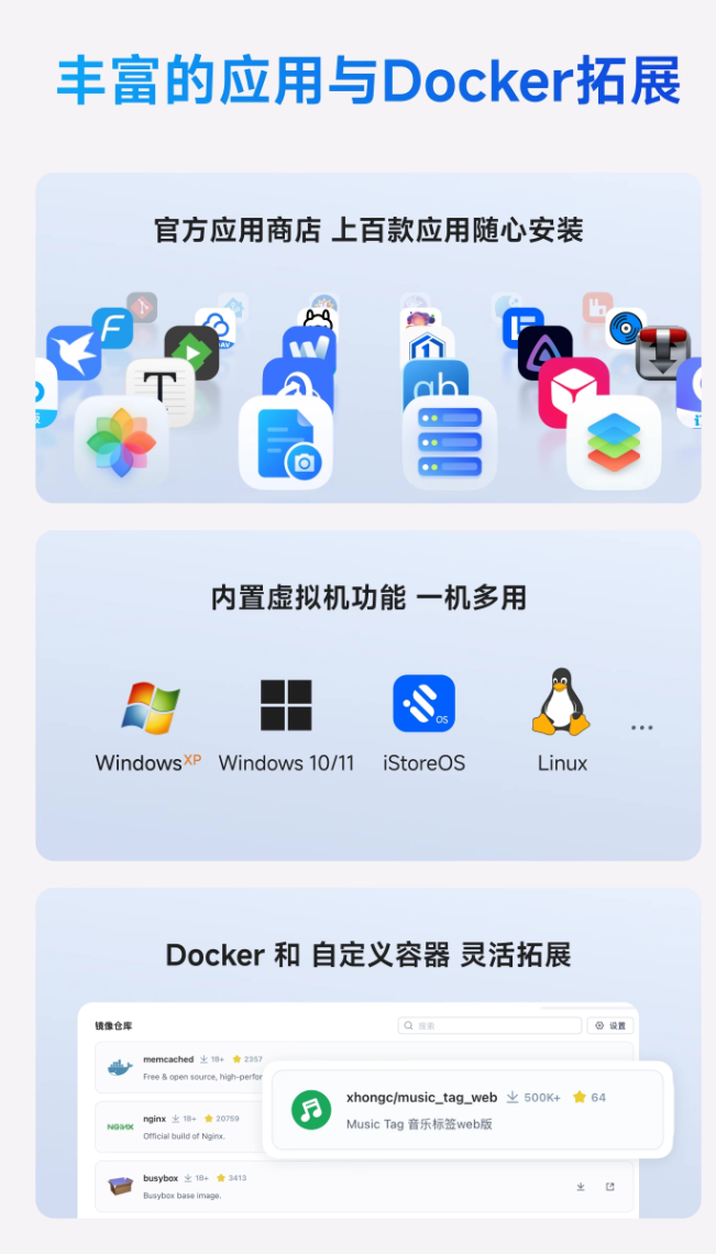 特色功能方面,这款 NAS 支持本地 AI 相册、影视娱乐中心,可自动刮削影音文件,满足多端同步需求,还可以无缝同步 PC 与 Mac 的文件,支持安装百度网盘、迅雷、Aria 2、Qbittorrent 等下载工具,兼容 Docker 生态。