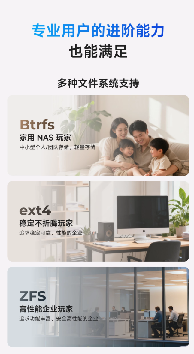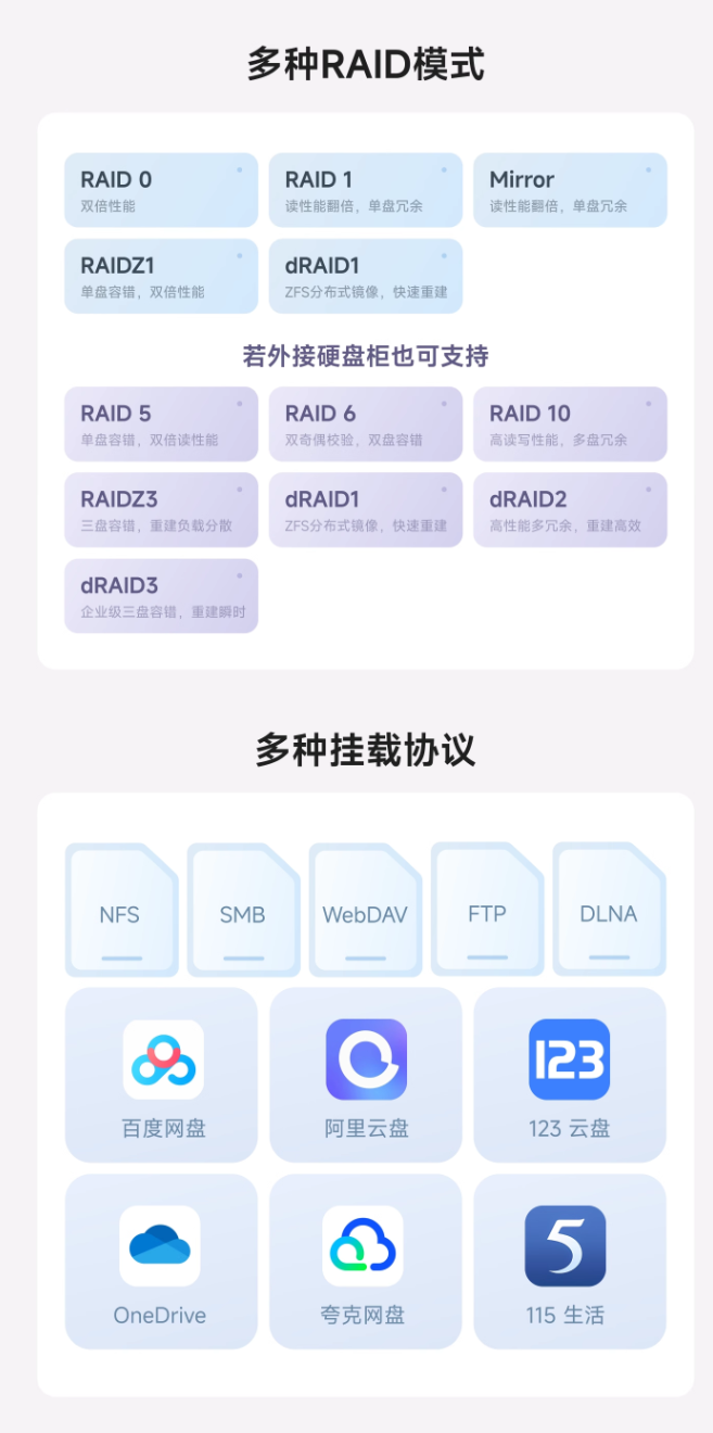 设计方面,这款 NAS 的机身较为小巧,高 121mm,相比同类产品小 50%,支持 Btrfs、ext4、ZFS 等文件系统,可使用 RAID 0/1/mirror/ RAIDZ1/dRAID 1 等冗余备份,外接硬盘柜后还可支持 RAID 5/6/10/Z3/dRAID 1/dRAID 2/dRAID 3 等。