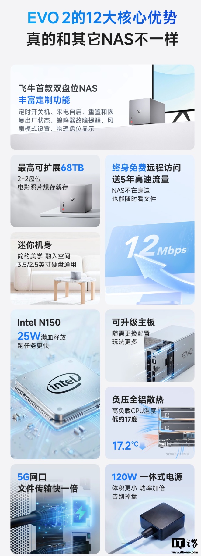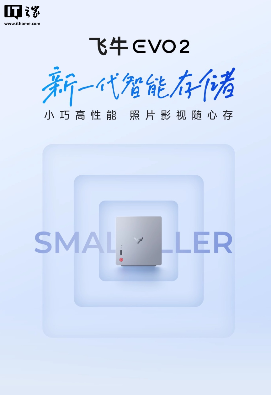 IT之家 12 月 15 日消息,飞牛首款自有 NAS EVO 2 现已在天猫平台开启预售,采用双盘位设计,支持安装 2.5/3.5 英寸机械硬盘,拥有 128GB NVMe 系统盘,最高可扩容至 68TB,售价 1999 元起。