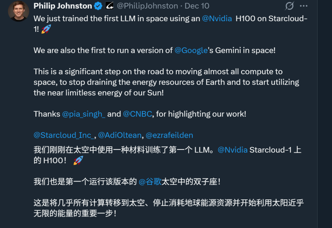 其联合创始人兼 CEO 激动表示,这是将几乎所有计算转移到太空、停止消耗地球能源资源并开始利用太阳近乎无限的能量的重要一步。