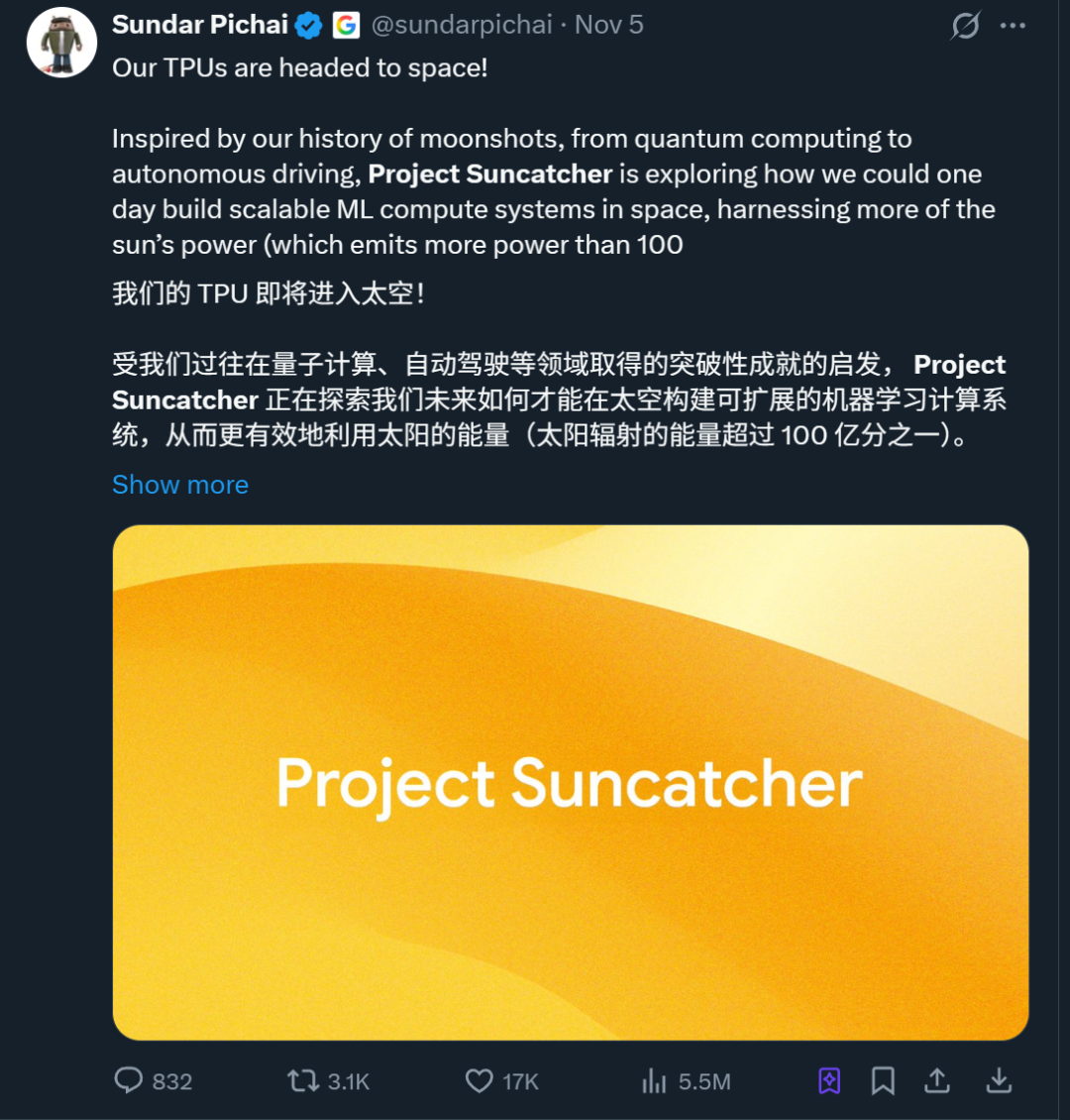 后又在谷歌宣布太空数据中心计划时留下“Interesting”这样的评论,明确肯定了谷歌的眼光。