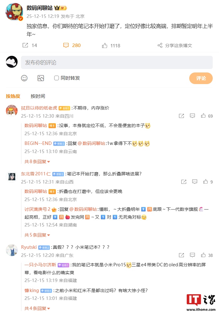 IT之家 12 月 15 日消息,博主 @数码闲聊站 今日发文透露,某厂高端定位笔记本开始打磨,排期暂定明年上半年。结合评论区讨论来看,该款高端笔记本预计归属小米品牌。