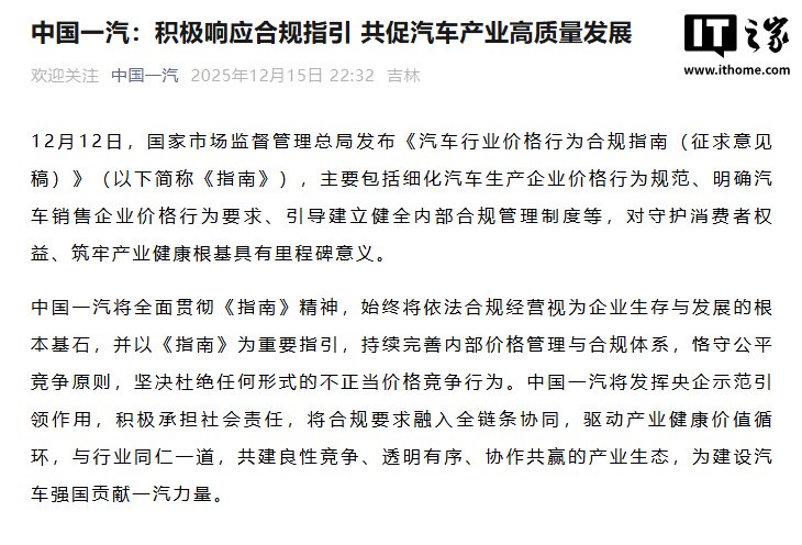 IT之家注意到,中国一汽还称,将发挥央企示范引领作用,积极承担社会责任,将合规要求融入全链条协同,驱动产业健康价值循环,与行业同仁一道,共建良性竞争、透明有序、协作共赢的产业生态,为建设汽车强国贡献一汽力量。