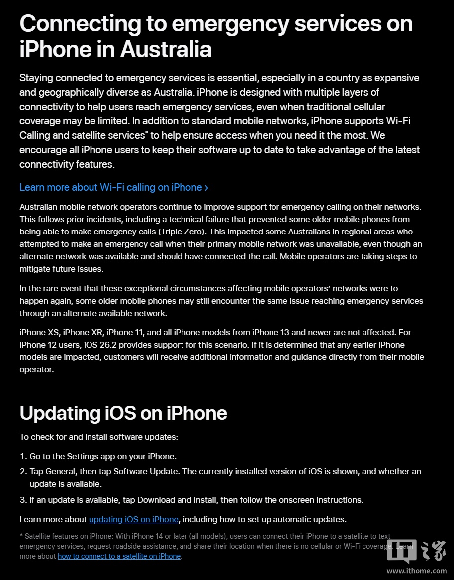 苹果表示:“iPhone XS、iPhone XR、iPhone 11,以及所有 iPhone 13 及更新机型均不受此问题影响。对于 iPhone 12 用户,iOS 26.2 更新已为此场景提供支持。如后续确认更早期的 iPhone 机型也受到影响,相关用户将直接从其移动运营商处获得进一步信息和指导。”