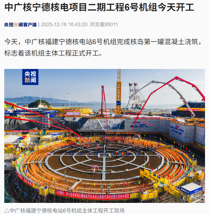 IT之家 12 月 16 日消息,据央视新闻报道,中广核福建宁德核电站 6 号机组今日完成核岛第一罐混凝土浇筑,标志着该机组主体工程正式开工。