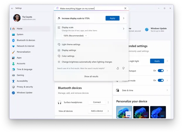 更新“设置”的搜索功能,可在搜索框和推荐页面中找到更多配置选项