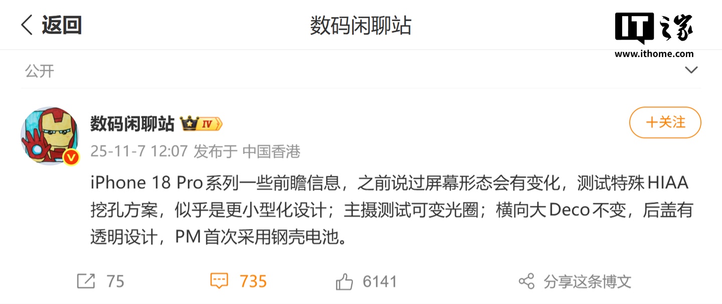 网友制作的渲染图,仅供参考,图源:X 平台该信息和 @数码闲聊站 今年 11 月爆料内容相符,当时消息称:“iPhone 18 Pro 系列一些前瞻信息,之前说过屏幕形态会有变化,测试特殊 HIAA 挖孔方案,似乎是更小型化设计;主摄测试可变光圈;横向大 Deco 不变,后盖有透明设计,PM 首次采用钢壳电池。”