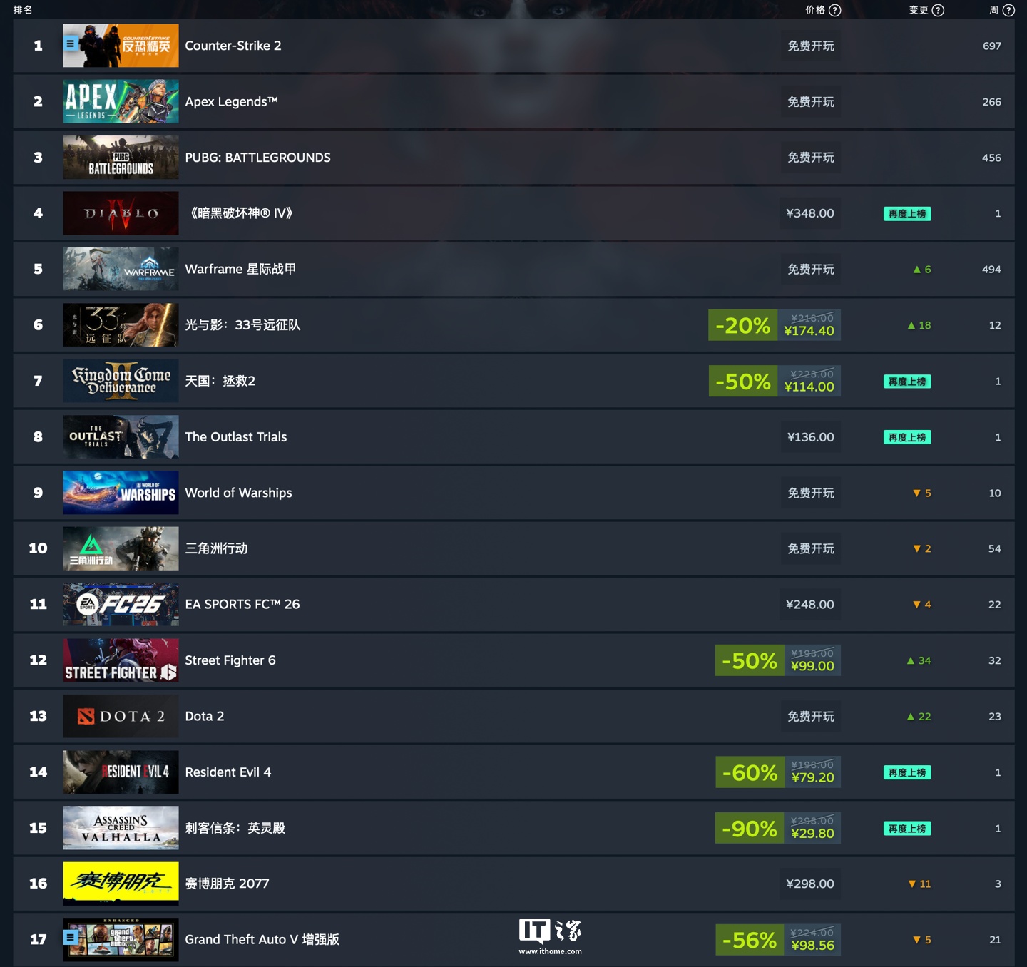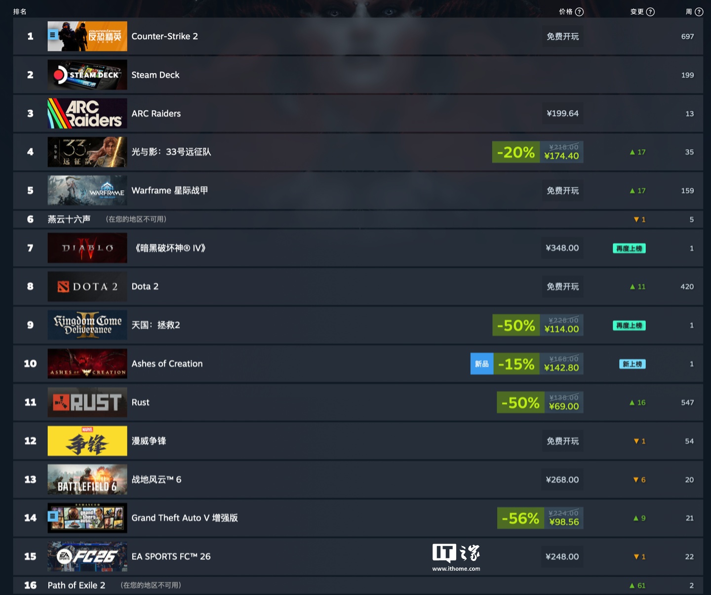 IT之家 12 月 17 日消息,Steam 现已公布最新一周游戏销量排行榜(2025 年 12 月 9 日-2025 年 12 月 16 日,无免费游戏),其中《ARC Raiders》登顶全球榜单,而 TGA 2025 中横扫 9 项大奖的《光与影:33 号远征队》排名在全球区及国区均大幅提升。