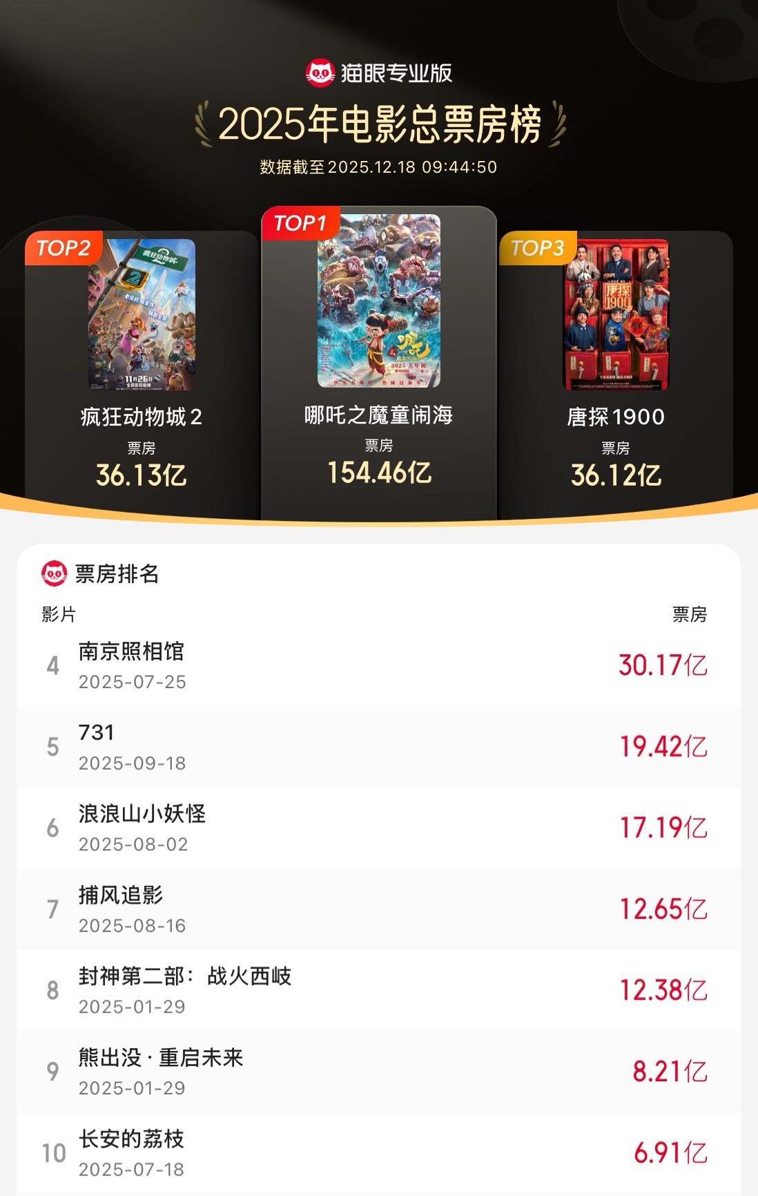 IT之家 12 月 18 日消息,据猫眼专业版数据,电影《疯狂动物城 2》累计票房(含预售)突破 36.13 亿,进入 2025 年度票房榜前二。总榜前十如下: