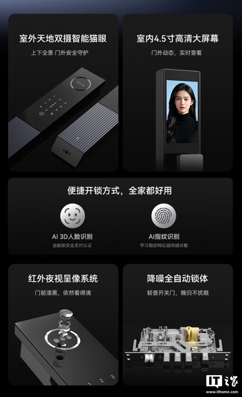 该门锁整体造型简洁,正面提供主摄及底部盲区摄像头,支持 App 远程查看室外情况,联网后方可按下门铃即可远程视频对讲。产品同时搭载 3D 人脸识别模组及红外夜视不管系统,覆盖 1.2-2 米身高人群。