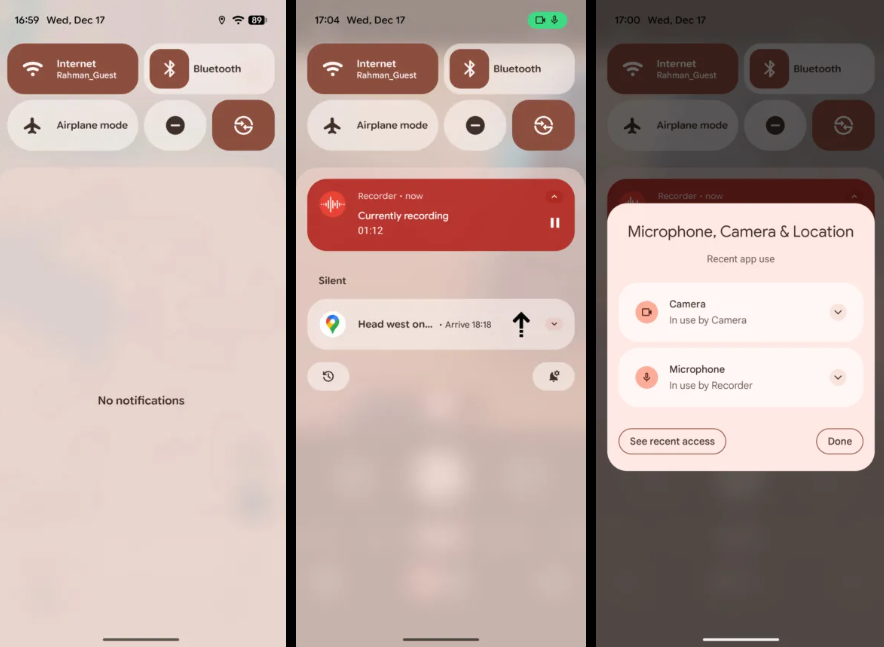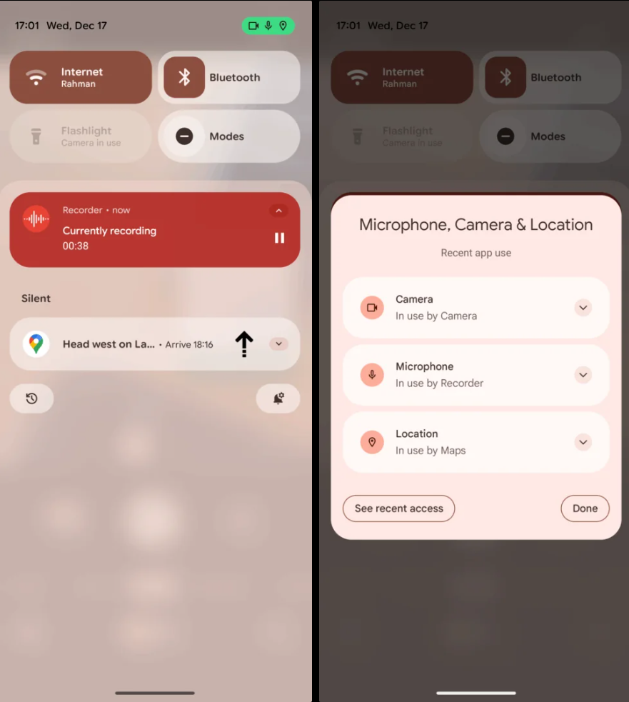 据IT之家了解,Android 16 QPR3 版本通过启用可展开式位置指示器,解决了这一问题。与摄像头、麦克风权限提醒采用的纯绿色背景不同,位置指示器的背景为纯蓝色(但如果有多个权限同时被调用,系统会将背景色切换回绿色)。更重要的是,“麦克风、摄像头和位置信息”对话框如今能够准确列出正在获取位置信息的具体应用。实际上,谷歌曾在 Android 13 系统中短暂测试过这项功能,但并未向公众正式推出。