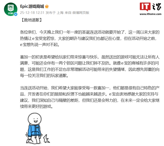 IT之家 12 月 18 日消息,Epic 游戏商城一年一度的圣诞连送活动将于今晚开始,官方却在今日中午向玩家道歉,称送出的游戏可能无法让所有人满意,可能还会伴有一两个锁区问题,因此想先郑重地向每一位关注我们的玩家道歉。
