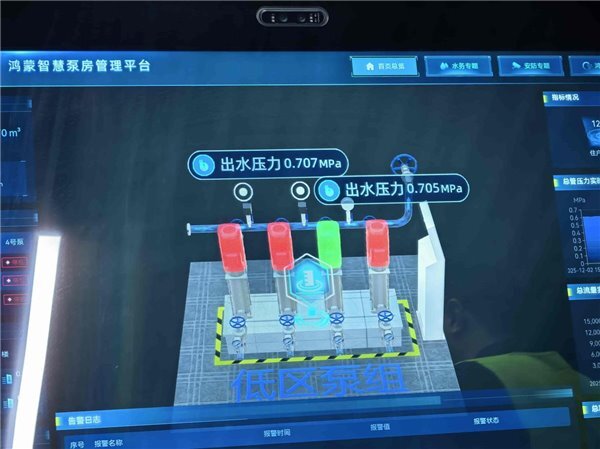 技术人员将鸿蒙手机轻轻贴近设备面板,屏幕上瞬间同步呈现水压、水质、能耗等实时数据,轻点触控即可完成参数调节,异常情况预警信息同步推送至运维平台。