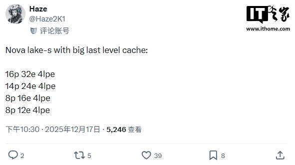 @Haze2K1 最新爆料称,Nova Lake 桌面平台将至少提供四种不同规格的不锁频(-K 系列)SKU,核心数量最高可达 52 核,缓存规模最高可达 288MB。