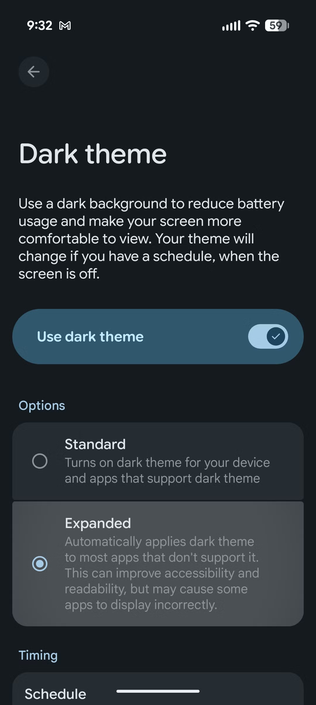 Android 系统于 2019 年加入系统级深色模式,然而一直以来仍有部分应用“无视”系统的深色主题设置,顽固地保持亮白界面。最近的一次更新中,系统对深色主题进行了扩展,即使应用本身不支持深色模式,也可以强制切换。报道提到,Pixel 手机率先获得了这项名为“扩展深色主题”的新功能。