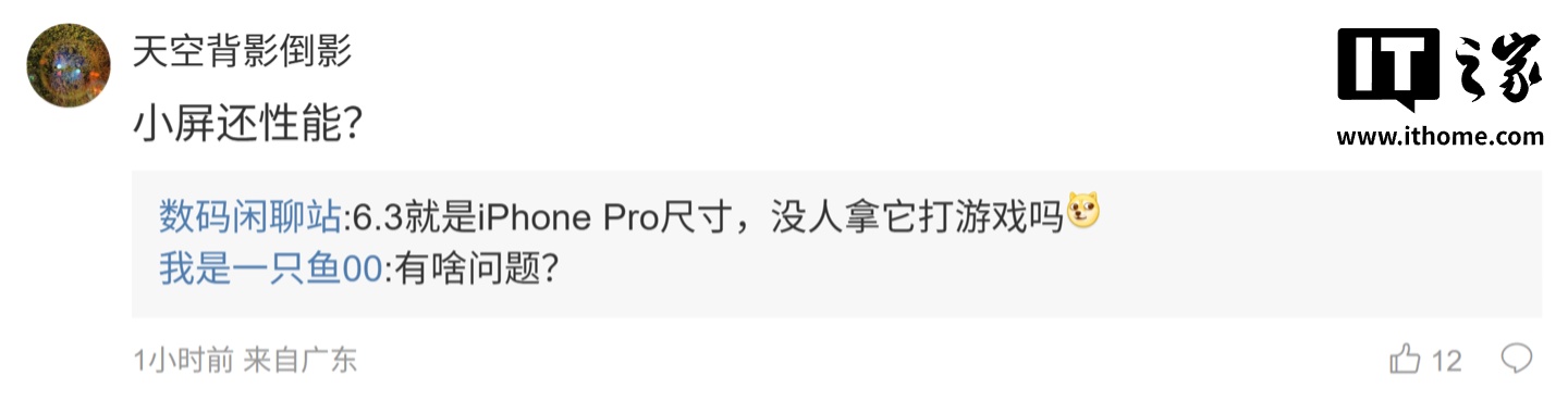 后续有用户在评论区表示:“小屏还性能?”,博主回复道:“6.3 就是 iPhone Pro 尺寸,没人拿它打游戏吗