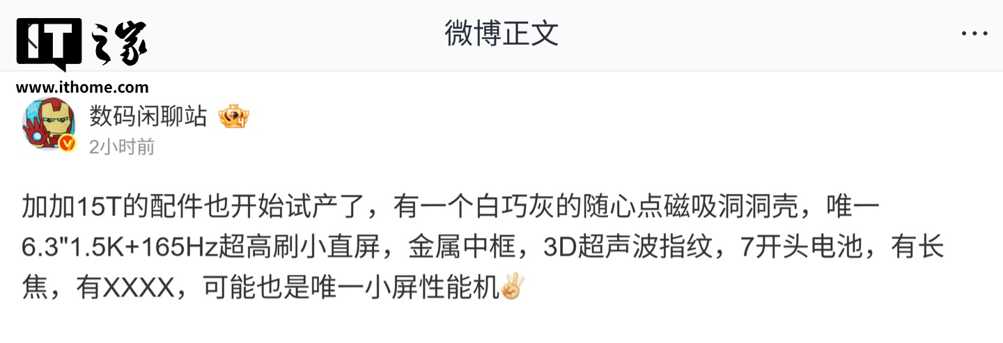 IT之家 12 月 20 日消息,博主 @数码闲聊站 今天在微博透露,某“加加”厂 15T 手机的配件一开始试产。