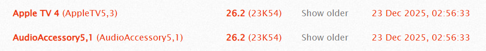 苹果公司面向第四代 Apple TV(硬件标识符为 AppleTV5,3)设备,发布了基于 tvOS 26.2 的固件版本更新,被标记为“iOS 26.2”,版本号为 23K54。