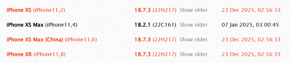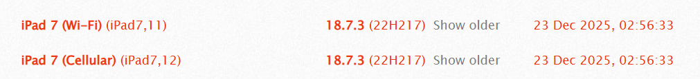此外苹果进一步推送 iOS / iPadOS 18.7.3 修正版,版本号为 22H217。本次推送的固件版本,和苹果 12 月 12 日发布的版本号相同,但进一步适配特定硬件型号。