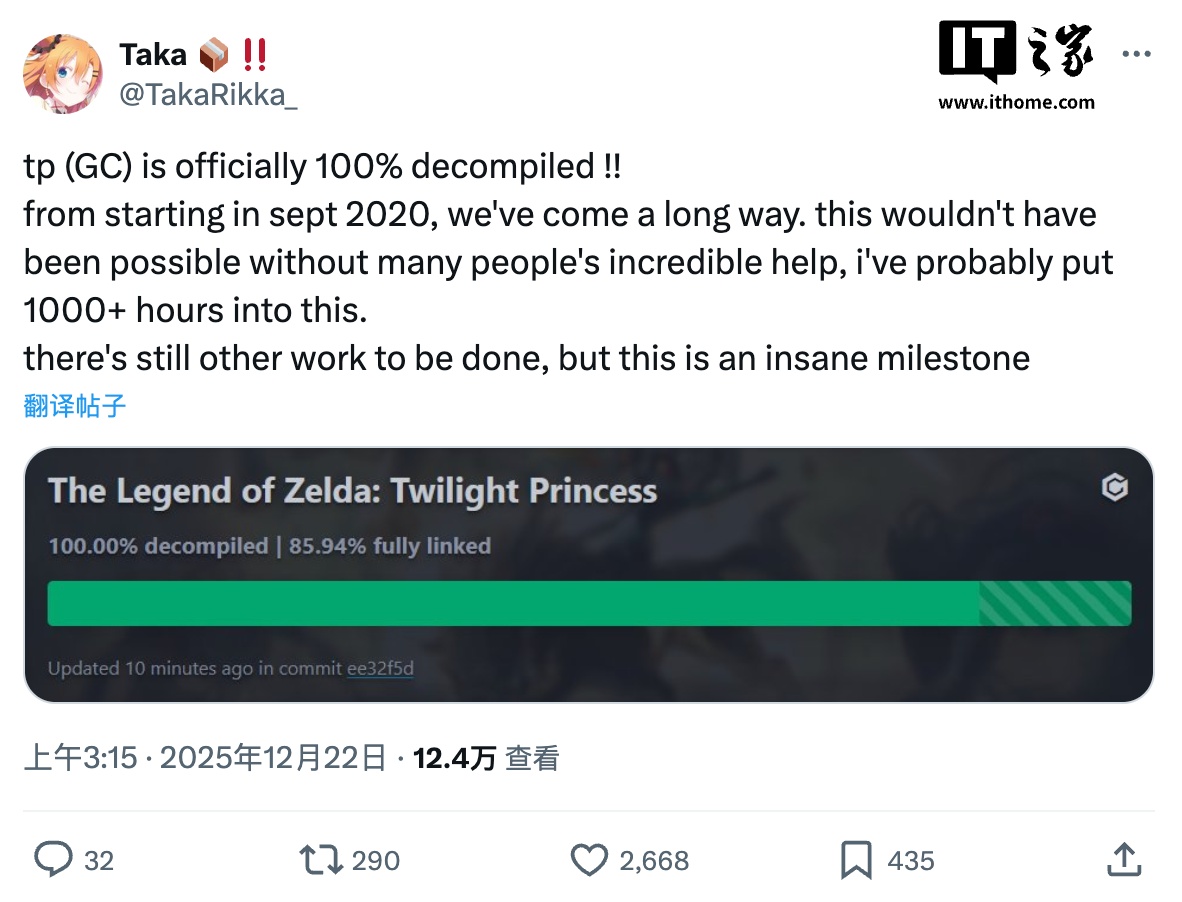 IT之家 12 月 23 日消息,第三方模组制作者 TakaRikka_及其团队自 2020 年 9 月起,历时五年多持续进行任天堂经典游戏《塞尔达传说:黄昏公主(The Legend of Zelda:Twilight Princess)》的反编译工程。