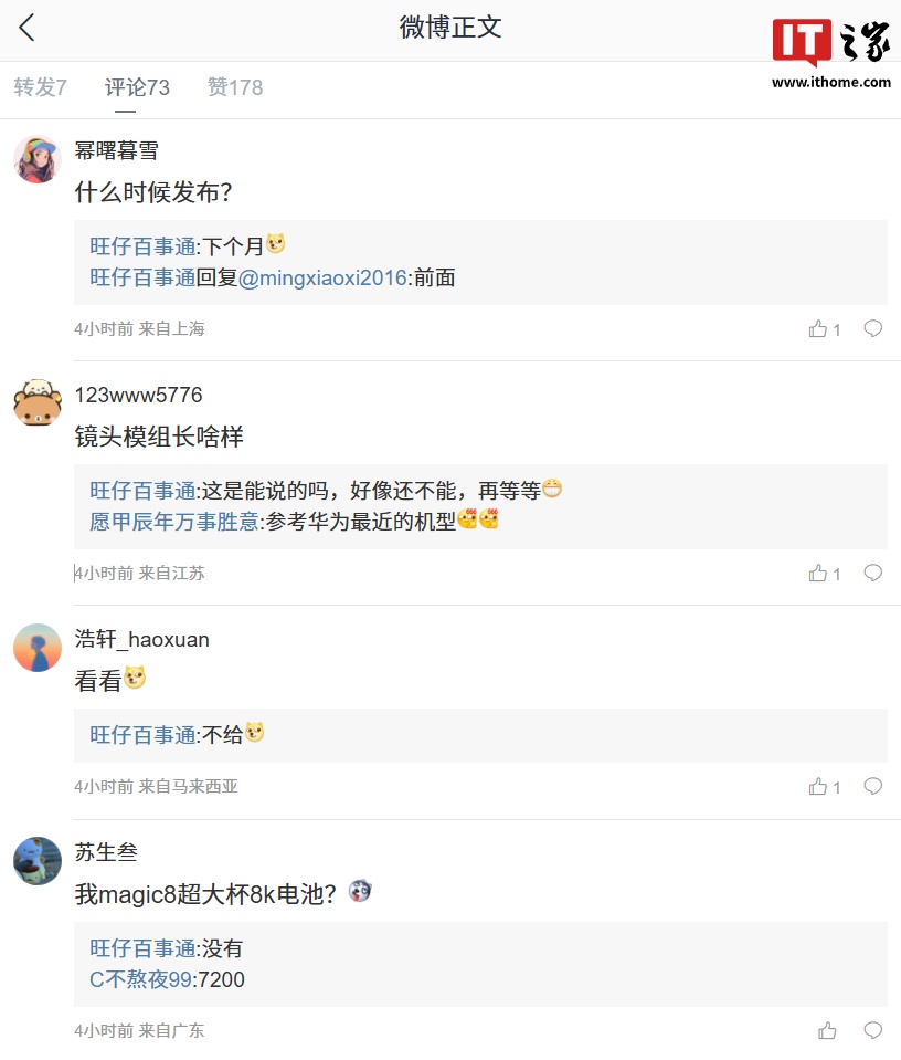 博主还在评论区回复了部分网友的问题:针对新机什么时候发布,他回复:“下个月。”针对 Magic8 的超大杯机型是否会配备 8000mAh 电池,他表示:“不给。”