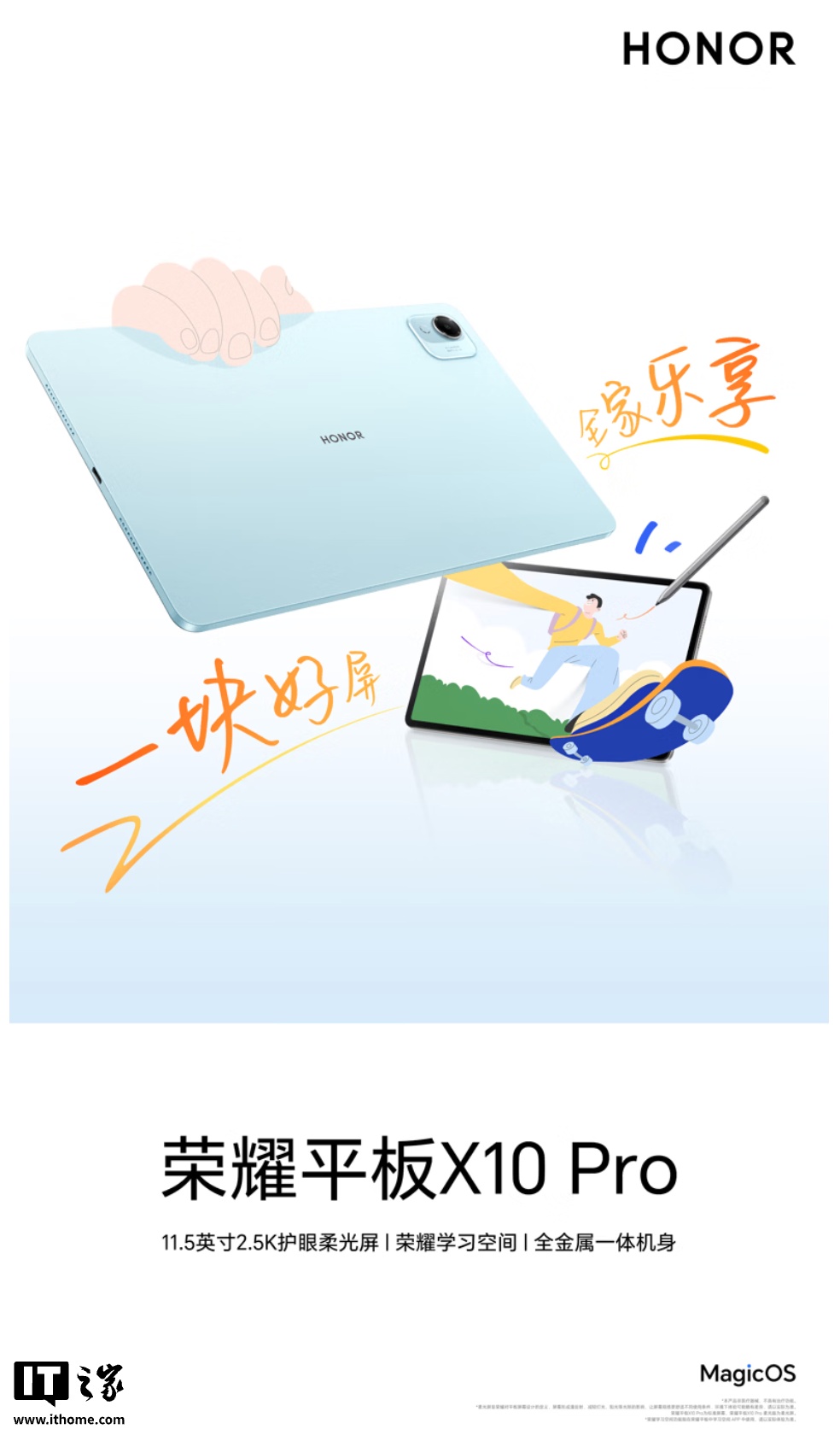 该机配备一块 11.5 英寸 2.5K 绿洲护眼屏,主打“全金属一体机身、荣耀学习空间”,搭载 8GB RAM,可选 128GB / 256GB 存储空间,提供“晴空蓝”配色。