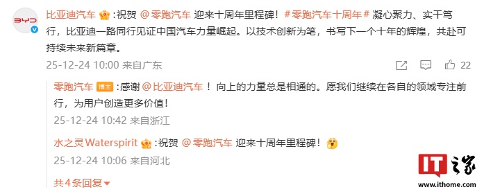 IT之家注意到,比亚迪汽车、理想汽车、蔚来等今日纷纷发文祝贺零跑汽车迎来十周年里程碑。