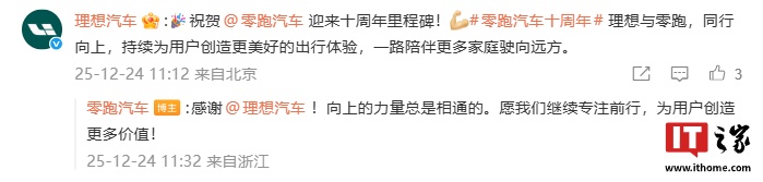 祝贺零跑汽车迎来十周年里程碑!理想与零跑,同行向上,持续为用户创造更美好的出行体验,一路陪伴更多家庭驶向远方。