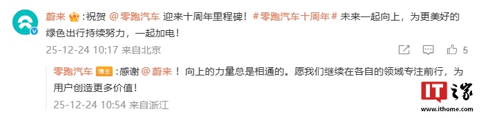 IT之家 12 月 24 日消息,零跑汽车今日迎来创立十周年,零跑汽车创始人、董事长、CEO 朱江明发布《致全体零跑人的一封信》,表示 2026 年要向着年销百万辆的目标发起挑战。