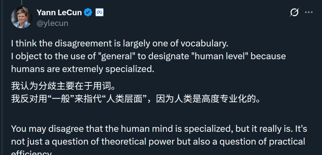 上述争论过后,LeCun 又再次出来回应了,而且这次直接点名了分歧核心 —— 用词。
