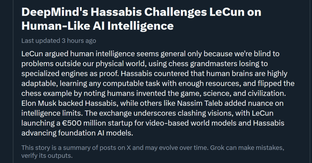并且,针对 LeCun 关于国际象棋棋手的评论,哈萨比斯认为人类能发明国际象棋本身就令人惊叹,更不用说从科学到波音 747 等现代文明的一切了。