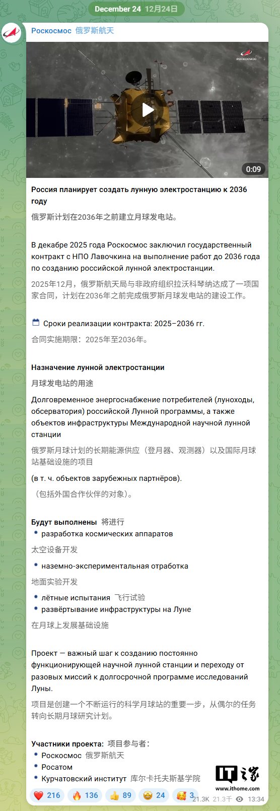 声明指出:“2025 年 12 月,俄罗斯国家航天集团与拉沃奇金科学生产联合体签署了一份国家合同,委托其在 2036 年前完成俄罗斯月球发电站的建设工作。”