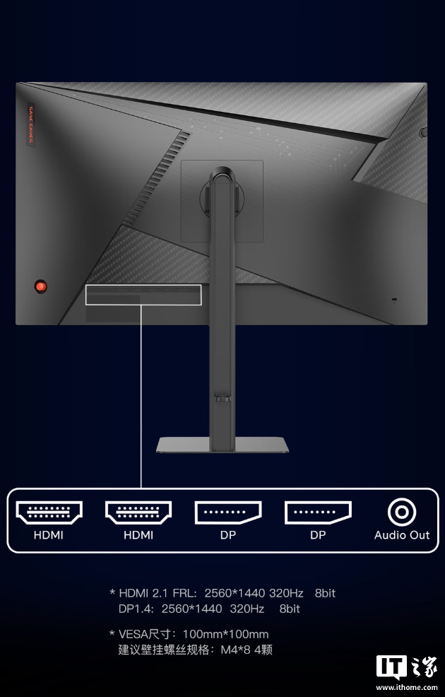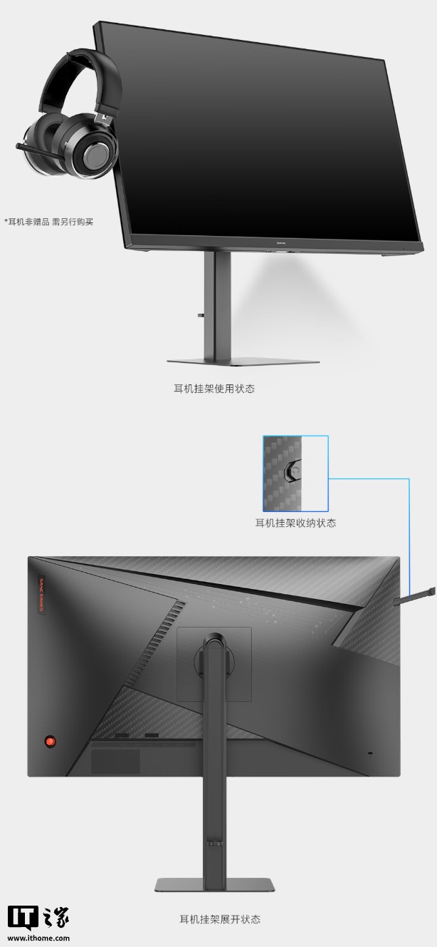 该机支架支持升降 / 倾斜 / 旋转,显示器本体提供耳机挂架,同时支持 VESA 100x100mm 壁挂,提供 2 个 HDMI 2.1、2 个 DP 1.4 接口。