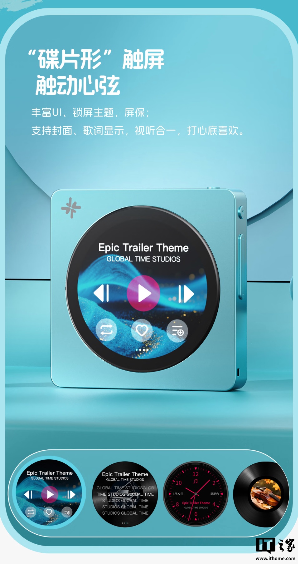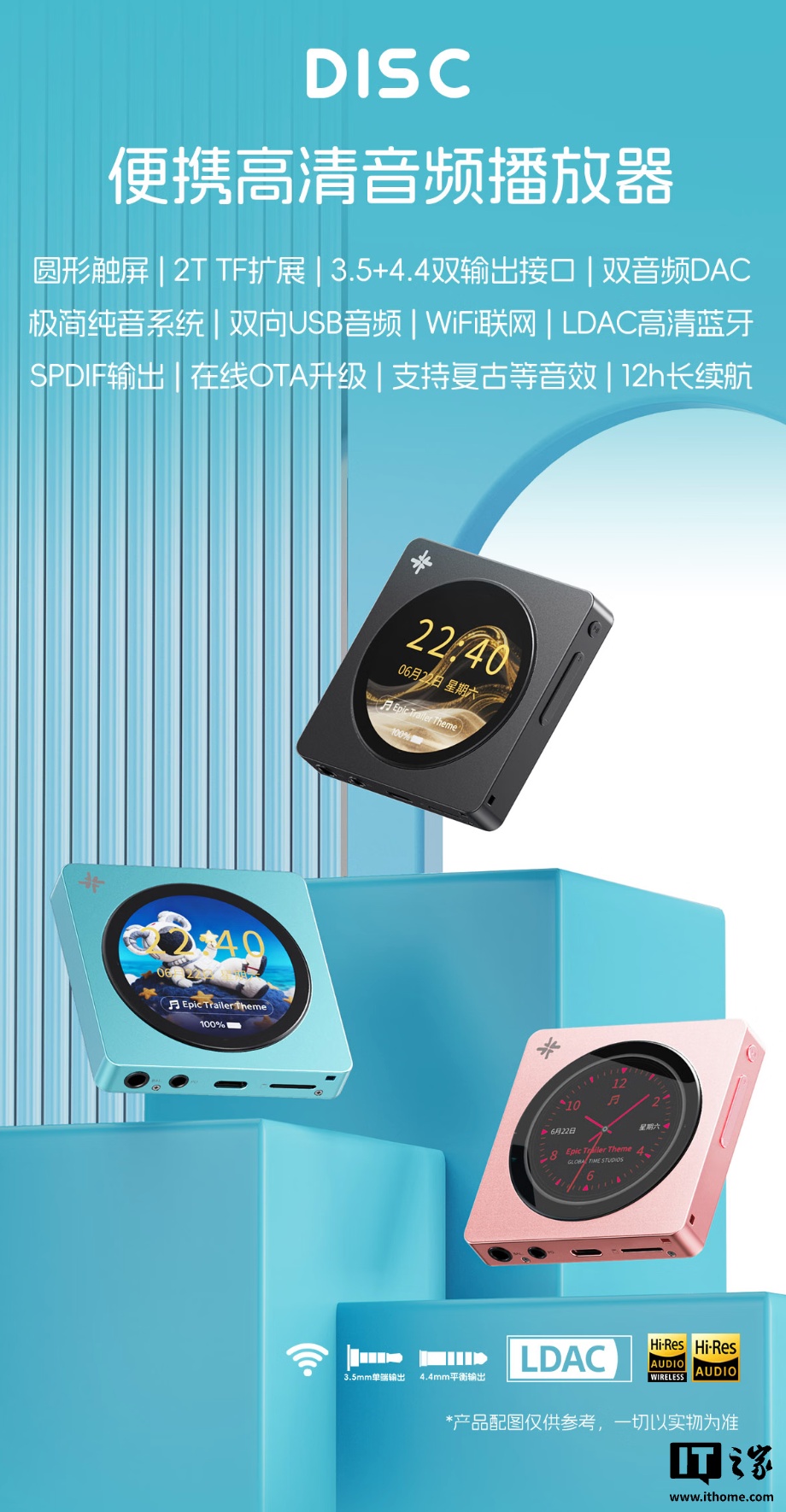 IT之家了解到,这款播放器可选三种配色,搭载圆形触控屏,内置两个 Cirrus Logic CS43131 音频 DAC,最大推力可达 280mW,可充分驱动耳机,配备极简纯音系统,专为听歌服务,没有多余的功能。