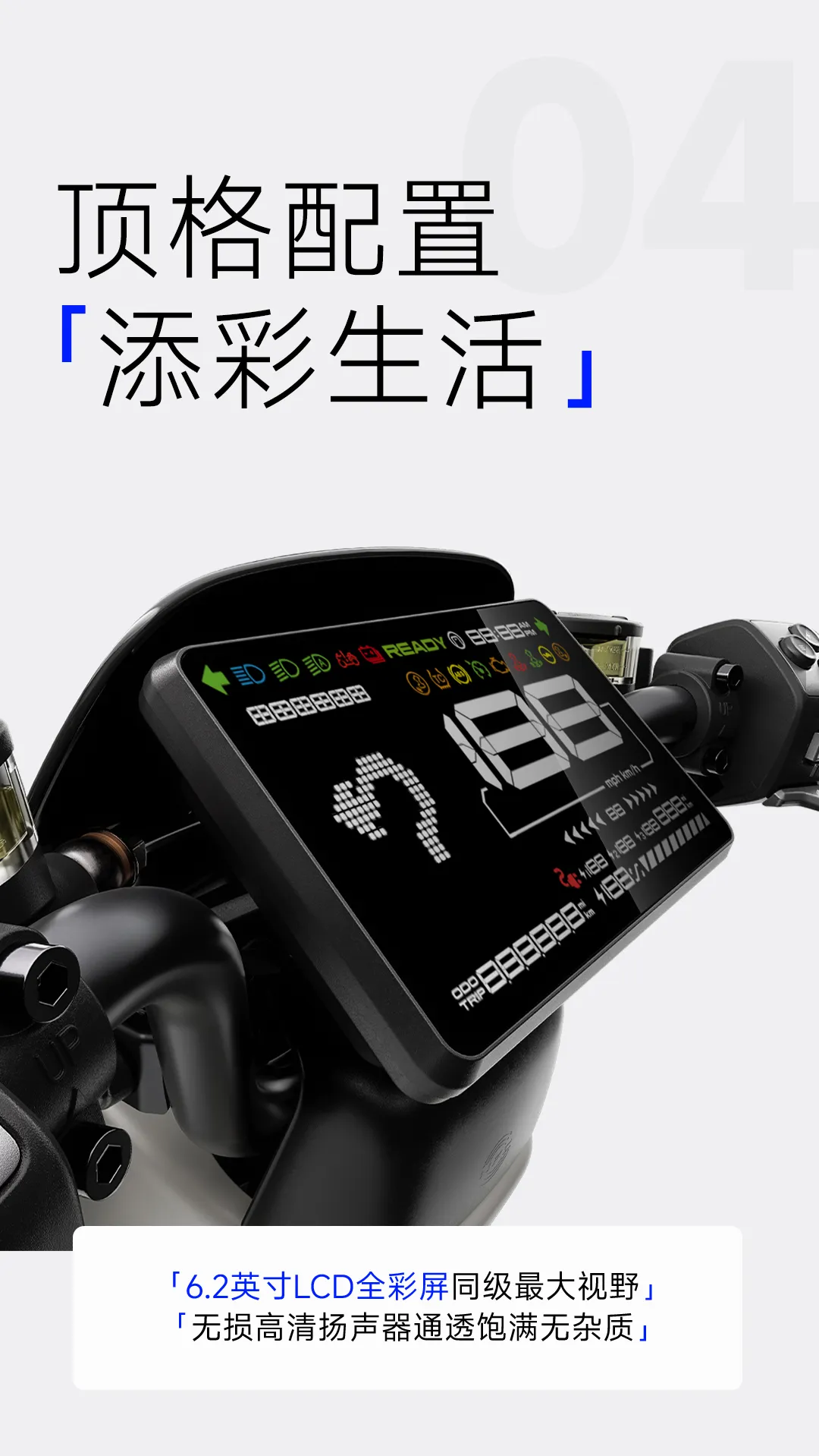 它采用了全新双边环绕式车架,宣称超 10000km+ 耐久测试,配备「摩托级液压双筒减震、五级可调后减震」,配备 6.2 英寸 LCD 全彩屏、无损高清扬声器。