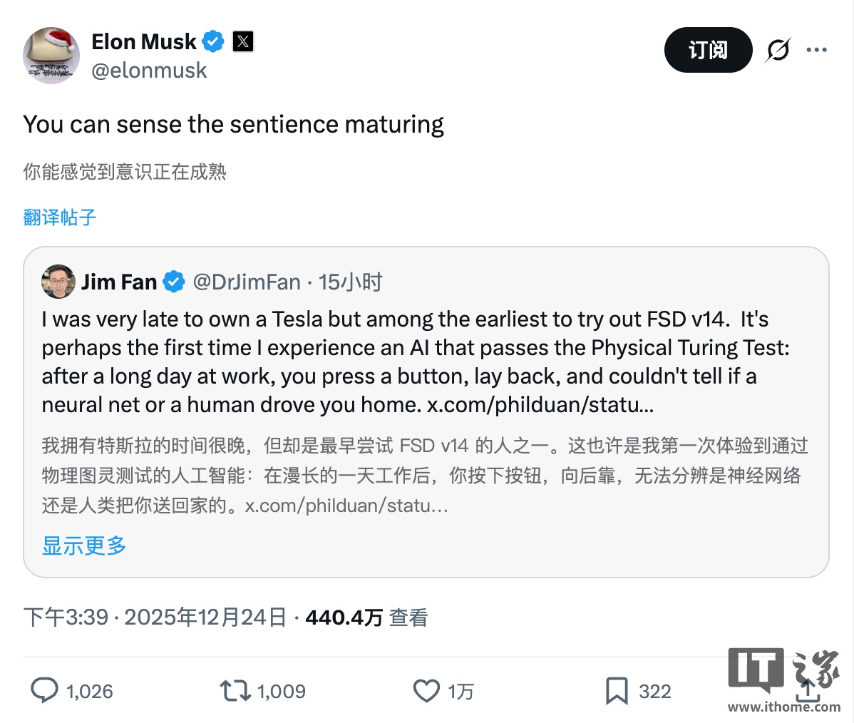 IT之家 12 月 24 日消息,今天清晨,英伟达机器人业务总监 Jim Fan 表示,特斯拉的 FSD v14(IT之家注:受监管的版本)首次让 AI 通过了他提出的“物理图灵测试”。