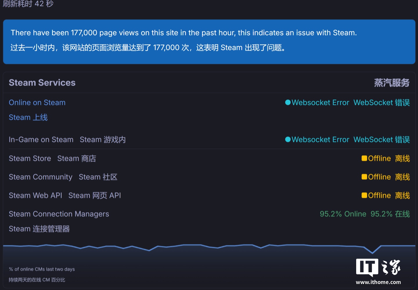 图源:来自微博用户反馈IT之家援引博文介绍,故障期间,用户面临黑屏及错误提示,DownDetector 收到数千份故障报告,SteamDB 更有超 25 万人次访问以确认状态。